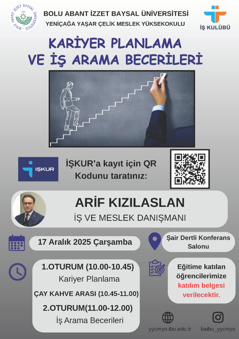Bolu Abant İzzet Baysal Üniversitesi Yeniçağa Yaşar Çelik Meslek Yüksekokulu, öğrencilerin mezuniyet sonrası kariyer yolculuklarına rehberlik etmek amacıyla anlamlı bir etkinliğe ev sahipliği yaptı. İŞKUR iş birliğiyle düzenlenen "Kariyer Planlama ve İş Arama Becerileri" eğitimi kapsamında, Bolu İŞKUR İl Müdürlüğünde görevli İş ve Meslek Danışmanı Arif Tumiçin KIZILASLAN öğrencilerle bir araya geldi. Yoğun katılımın olduğu programda, iş gücü piyasasına ilk adımı atacak olan gençlerin donanımlı hale gelmesi hedeflendi.
