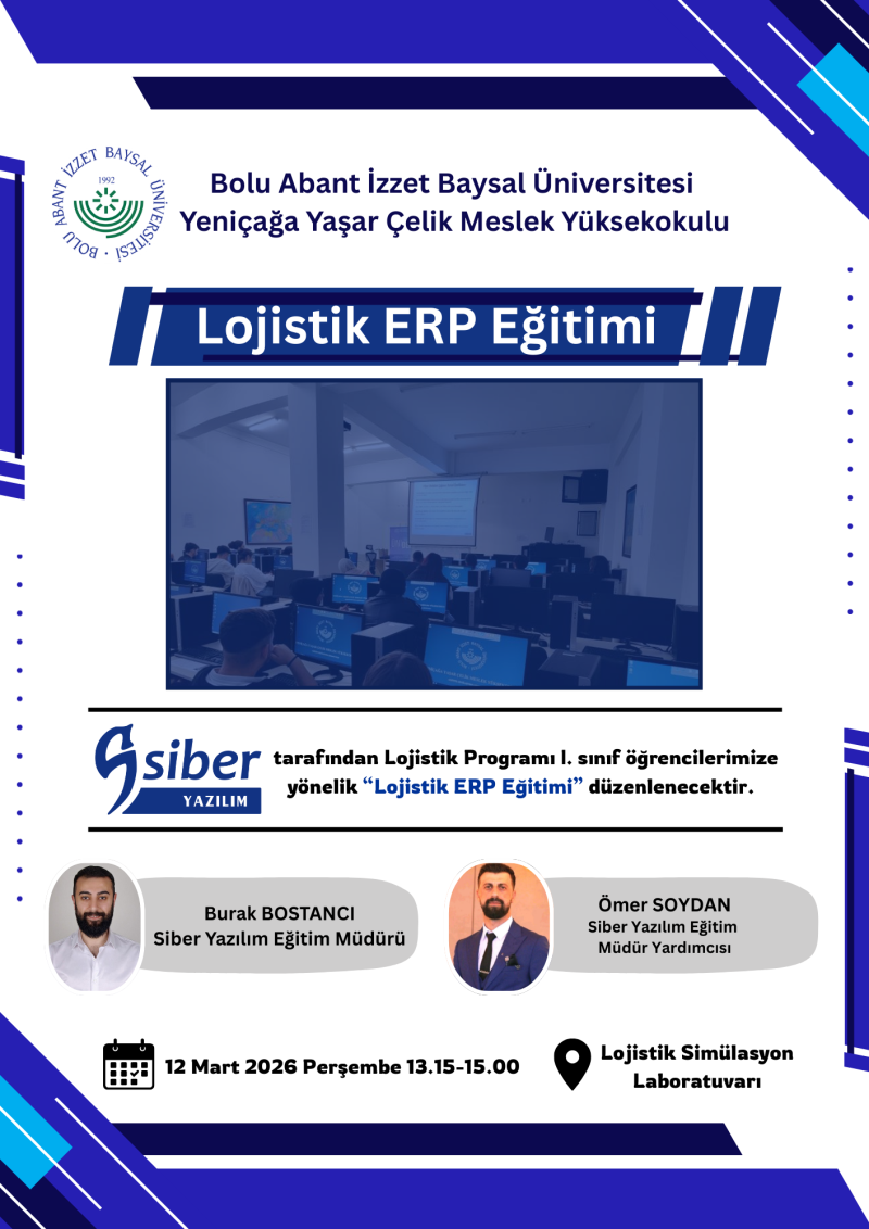 12 Mart 2026 tarihinde sektörün öncü kuruluşlarından Siber Yazılım A.Ş. tarafından Meslek Yüksekokulumuz Lojistik Simülasyon Laboratuvarında Müdür Yardımcımız Öğr. Gör. Gülriz Hande YILMAZ moderatörlüğünde Lojistik Programı öğrencilerimize yönelik "Lojistik ERP Eğitimi" düzenlendi.