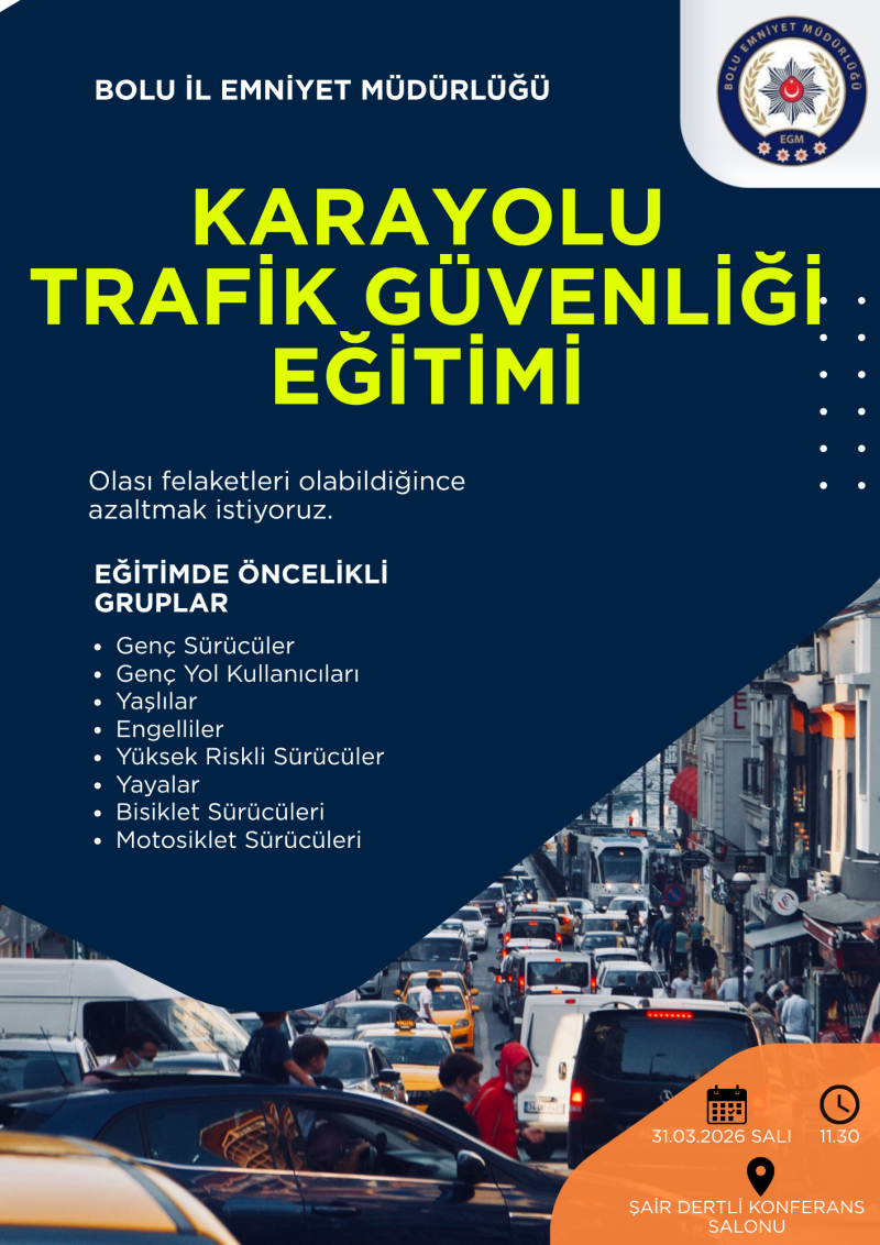 Meslek Yüksekokulumuz Şair Dertli Konferans Salonu’nda, Yeniçağa İlçe Emniyet Müdürlüğü personeli tarafından "Karayolu Trafik Güvenliği Eğitimi" gerçekleştirildi. Öğrencilerin ve personelin ilgiyle takip ettiği programda, trafikte güvenli sürüş ilkeleri ve yaya önceliği konularına dikkat çekildi.