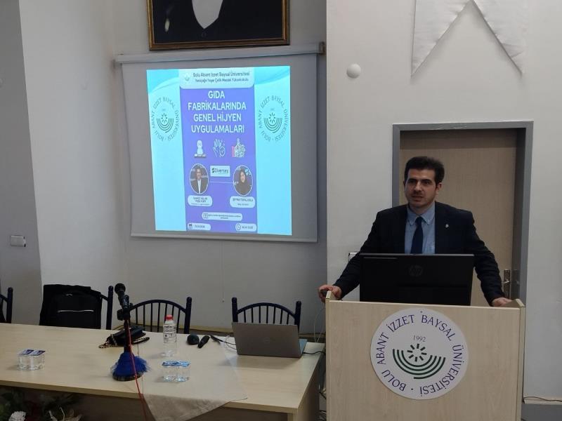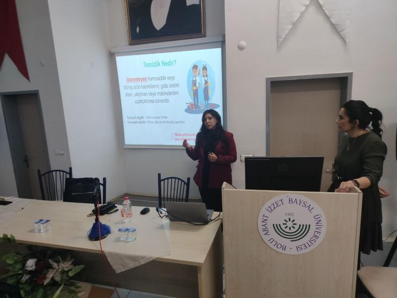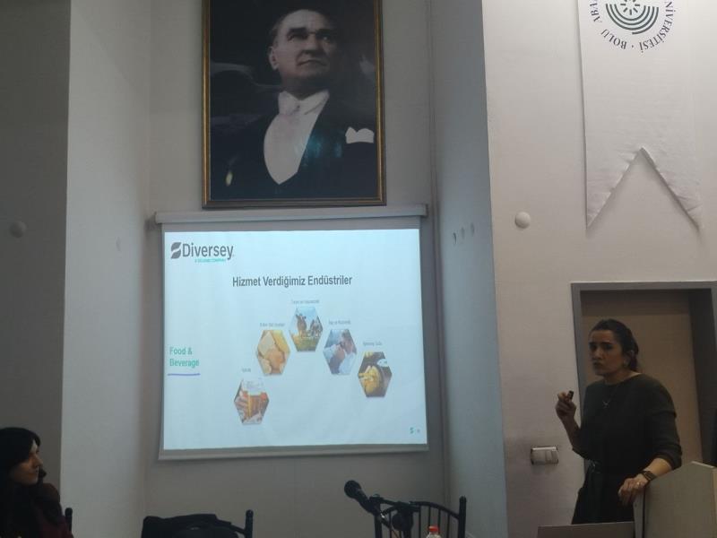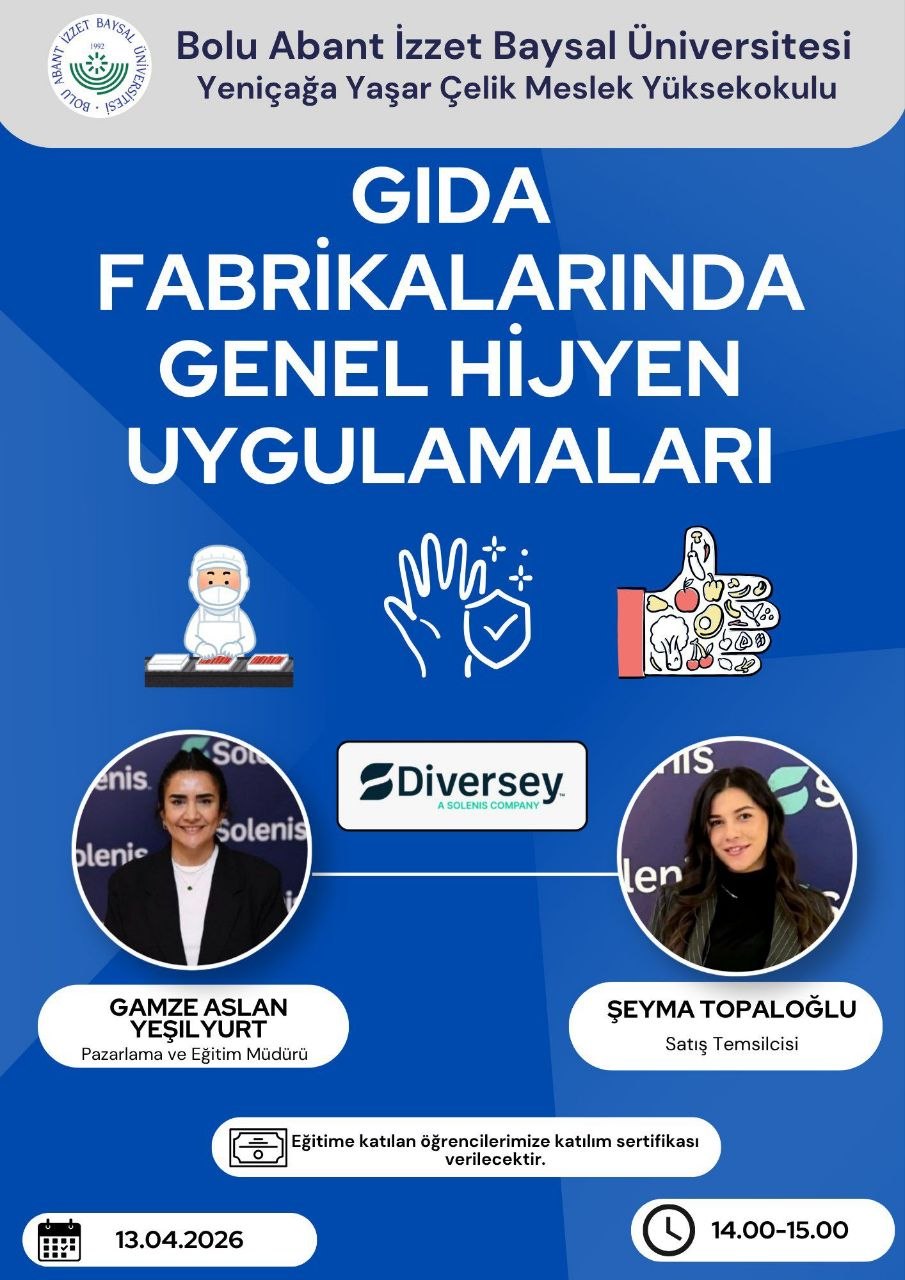 13 Nisan 2026 tarihinde Meslek Yüksekokulumuz Şair Dertli Konferans Salonunda Diversey (Solenis) Şirketi Pazarlama ve Eğitim Müdürü Gamze Aslan Yeşilyurt ve Diversey (Solenis) Şirketi Satış Temsilcisi; aynı zamanda mezun öğrencimiz Şeyma Topaloğlu, Yeniçağa Yaşar Çelik Meslek Yüksekokulu Gıda Kalite Kontrolü ve Analizi programı Öğrencilerine, Bolu Teknik Bilimler MYO Gıda Teknolojisi Öğrencilerine ve Mühendislik Fakültesi Gıda Mühendisliği Öğrencisine yönelik "Gıda Fabrikalarında Genel Hijyen Uygulamaları" eğitimi düzenlediler.