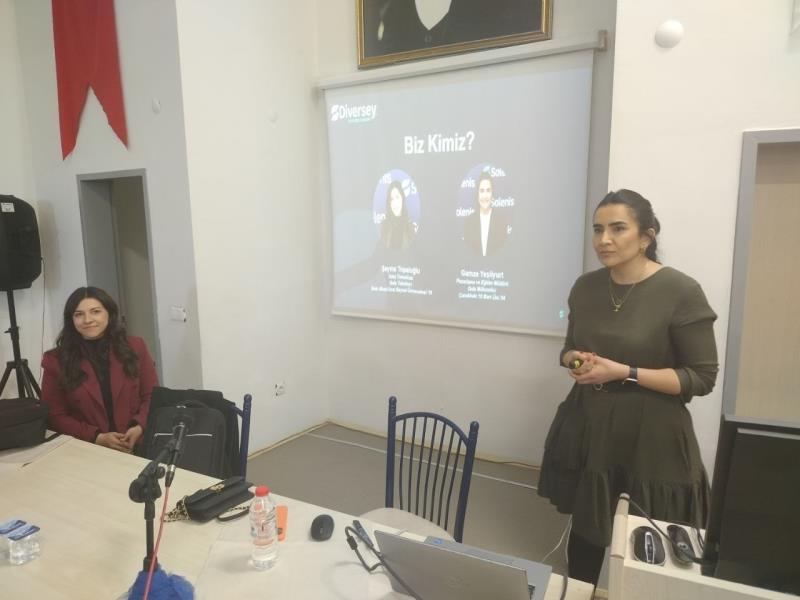 Müdürümüz Doç. Dr. Uğur Soykan açılış konuşması yaparak değerli konuklarımıza Meslek Yüksekokulumuz hakkında genel bilgilendirmeler yaptı. Ardından Sayın Yeşilyurt ve Topaloğlu, öncelikle çalıştıkları kurum olan Diversey (Solenis) şirketi hakkında genel bilgiler vererek eğitime başladı. Gıdalarda hijyeninin önemi, dezenfektan uygulamaları, gıdalarda üretim ve paketleme süreçleri, fabrikalarda uygulanan hijyen uygulamaları ve bazı hijyen kavramları gibi konulara değinildi. Eğitim esnasında öğrencilerimiz değerli eğitmenlerimizin hazırladıkları QR kodu okutarak eğitime aktif katılım da sağladı. Ayrıca eğitim sonunda Diversey (Solenis) şirketi tarafından öğrencilerimize katılım sertifikası verilecektir.