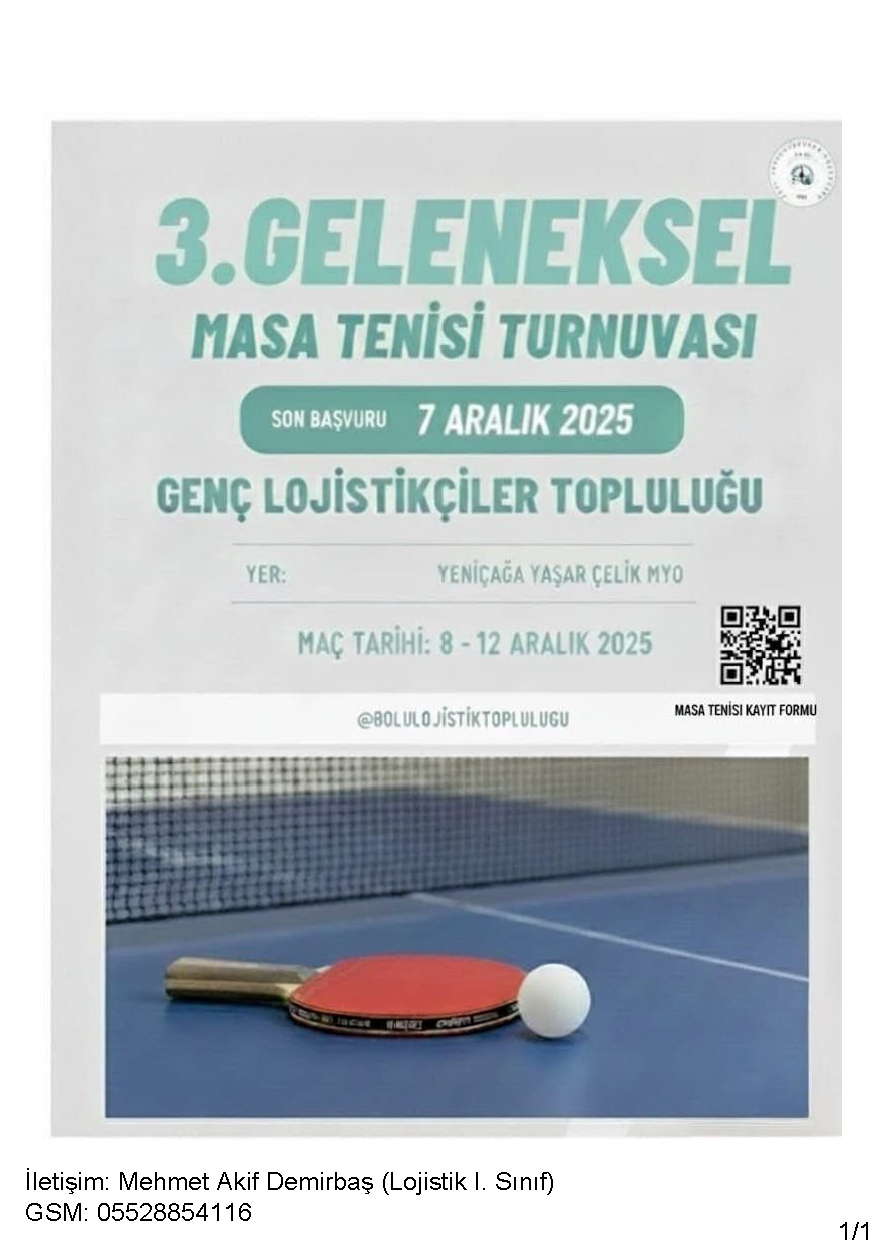 Genç Lojistikçiler Topluluğu tarafından, Yeniçağa Yaşar Çelik Meslek Yüksekokulu bünyesinde 3. Geleneksel Masa Tenisi Turnuvası, 8–12 Aralık 2025 tarihleri arasında düzenlendi. Dört bölümden toplam 20 öğrencinin katılım sağladığı turnuva, öğrenciler arasında sportif rekabetin yanı sıra birlik ve beraberlik duygularını da pekiştirdi.