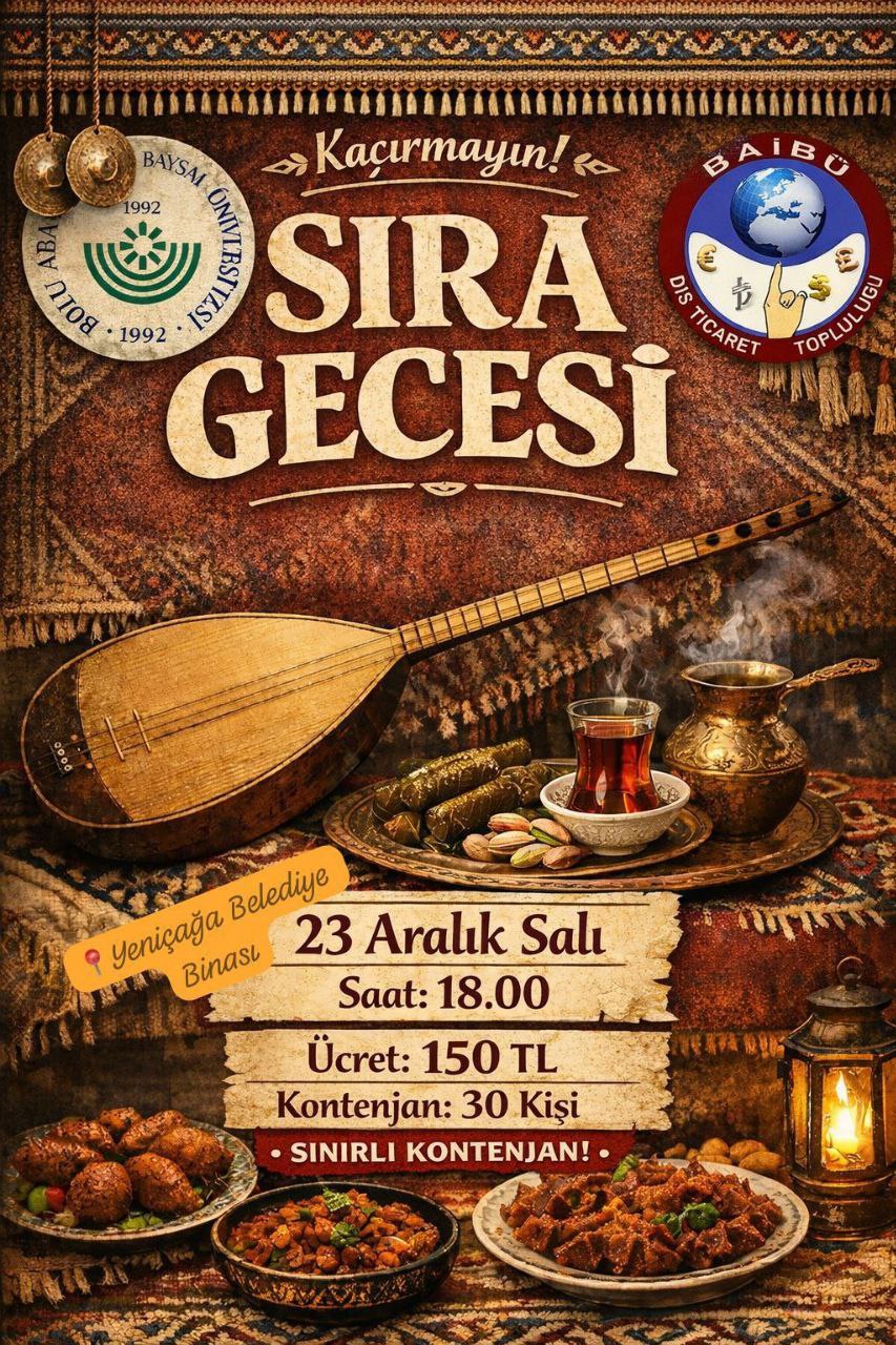 Dış Ticaret Topluluğu, Yeniçağa İlçe Gençlik Müdürlüğü'nün katkılarıyla Yeniçağa Belediye Binasında 23 Aralık 2025 tarihinde sıra gecesi etkinliği düzenledi. Türkü dinletisi ve çiğ köfte ikramı ile sona eren etkinlik, fotoğraf çekimleri ile sonlandı.